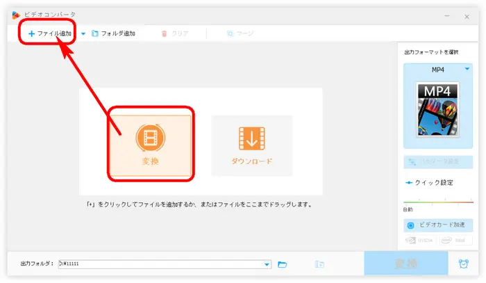 「+ファイル追加」をクリックして、ダウンロードしたYouTubeファイルをソフトに追加します。