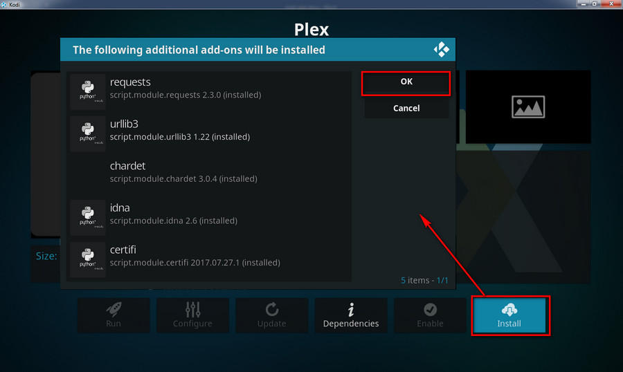Step 4. Click the Install option on the lower right corner. Then it will tell the additional add-ons that will be installed, as well. Just click on OK. It would take seconds before the installation process is started and the download progress will also be displayed on the right side of the addon.