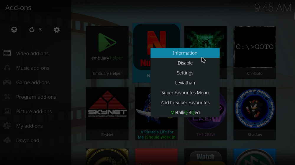 Step 7. From Video add-ons, highlight and right-click (or long press the select button on a remote or press C on a keyboard) on an addon that you intend to install/update ResolveURL for, to open its context menu, and click Information to enter its Settings menu.