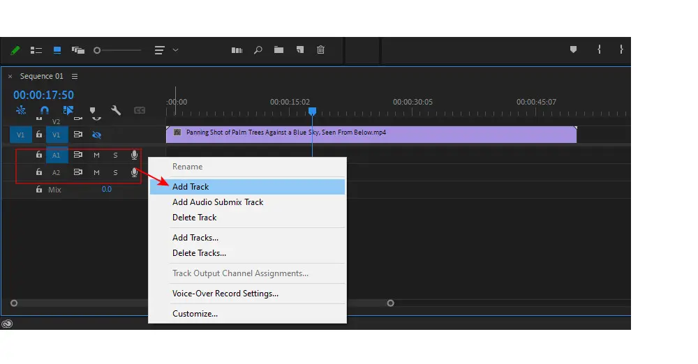 Get ready the audio track in the Timeline to which you want to add the voice-over. If you need a new audio track, right-click on the Timeline and select ‘Add Track’.