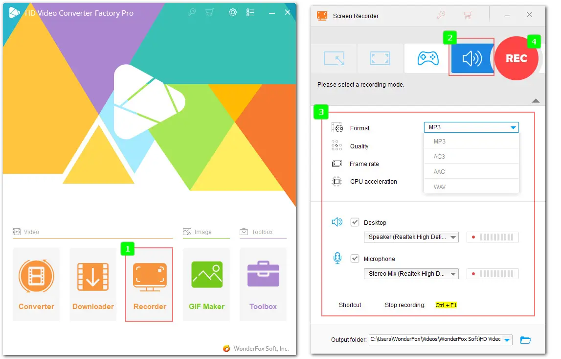 🛠️ Try an audio recorder alternative if all the fixes don’t work. For instance, WonderFox HD Video Converter Factory Pro. It enables you to record system sound, microphone audio, or both simultaneously and save the audio as MP3, WAV, AAC, or AC3 files. Without a complicated interface and setup process, it makes voiceover recording a breeze for everyone.