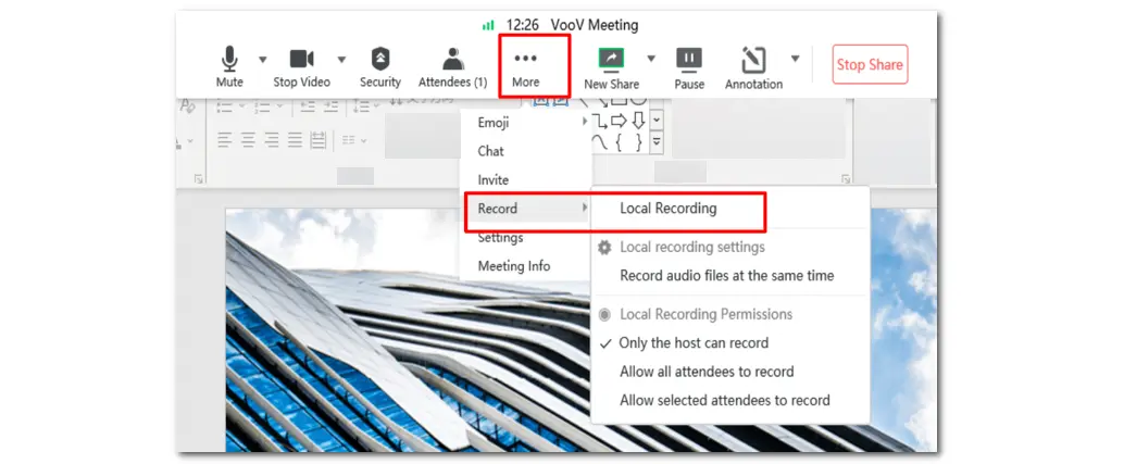 If you are a participant, you need to first ask the recording permission from the meeting's host. The meeting's host can change the recording permission under the "More" > "Record" > "Local Recording" option.