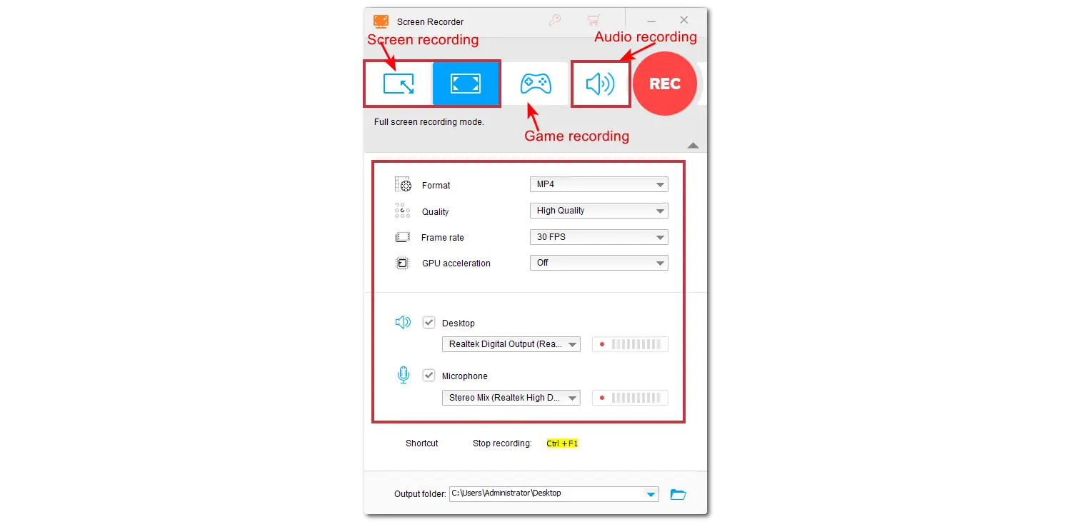 Step 5. Click the bottom ▼ icon to choose an output folder for your recording. Then, click the "REC" button and it will start recording after a five-second countdown.
