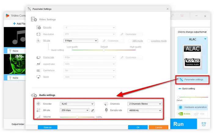 If needed, press "Parameter settings" button underneath the format profile to open a window, where you can change audio bitrate, encoder, channel mode, audio sample rate and decrease/increase audio volume right there. Click OK to save the settings.