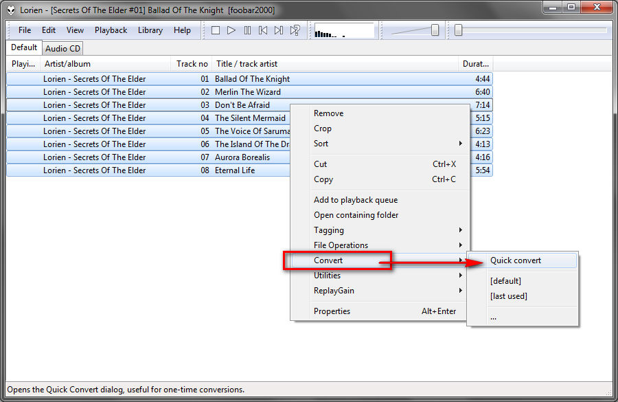 Step 3. Select all tracks and right click your mouse, select "Convert" > "Quick convert" in the context menu. Select your preferred lossless audio format and press "Convert" button to start the conversion.