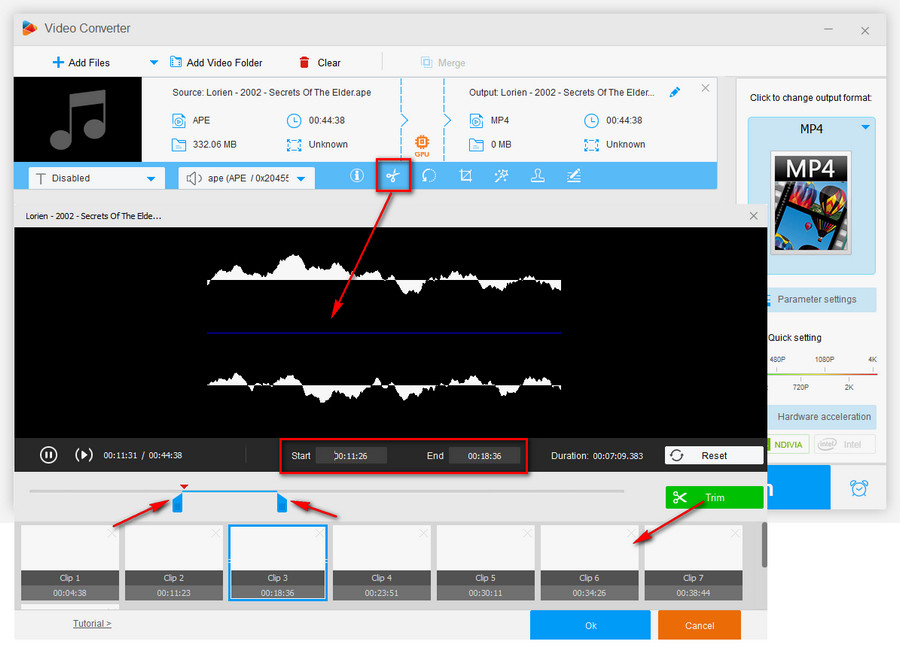 Step 2. Press the scissor-shaped Trim icon to pop up a new window. Here you can drag the two sliders to determine each track and hit the green Trim button to split multiple chunks. Alternatively, enter Start/End time to make it more accurate. After done, click OK to go back to the main interface of the APE converter.