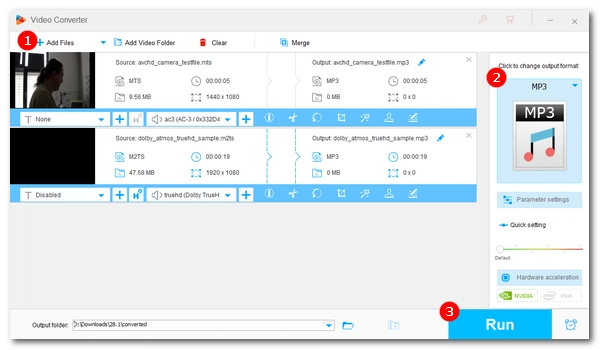 Click the ▼ button at the bottom to set an output path. Finally, press Run to convert AVCHD to MP3/WAV at once. The process will take only a few seconds to minutes. Once done, you can check the output files in the new pop-up window.