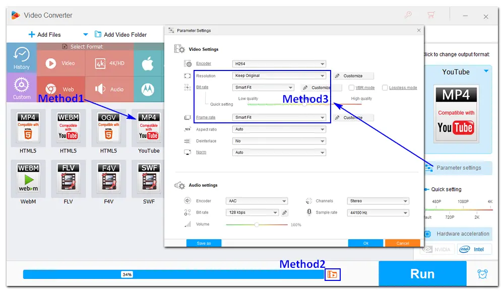 You can also downscale the video resolution, lower bitrate, or reduce frame rate to reduce the file size. Go to "Parameter settings" to select a lower value from the drop-down menu (check the best YouTube video specs). Then, press "OK" to save the change.