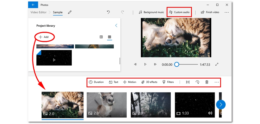 Step 4. From the Project library, click + Add to load the photos or videos (you can make them on your own or get them from the web) and add them to your Storyboard, where you can make further edits.
