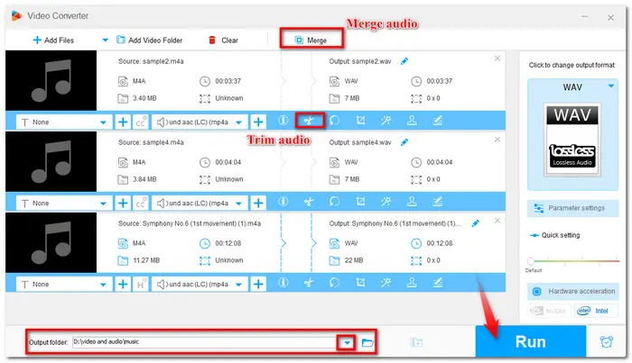 Go back to the main interface. Here you can press the scissor-shaped icon to trim the audio file. Then click the bottom inverted triangle button to specify an output folder or leave it as default. Finally, hit the Run button to start converting M4A to WAV conversion in Windows 10.