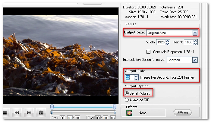 Step 3. On the right panel, modify the output size, output rate, and output option as needed. It is recommended that you choose the original size, keep the output rate the same as the frame rate, and select “Serial Pictures” if you want to convert the video to a JPG sequence. You can also click “Effects” and choose an effect for the image.