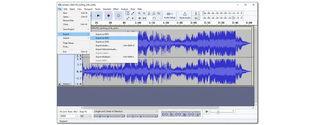You can make some edits to the audio track, like cutting the audio in audacity. Then, click “File” > “Export” > “Export as WAV”. Just follow the onscreen prompts to save the WAV file to your desired folder.