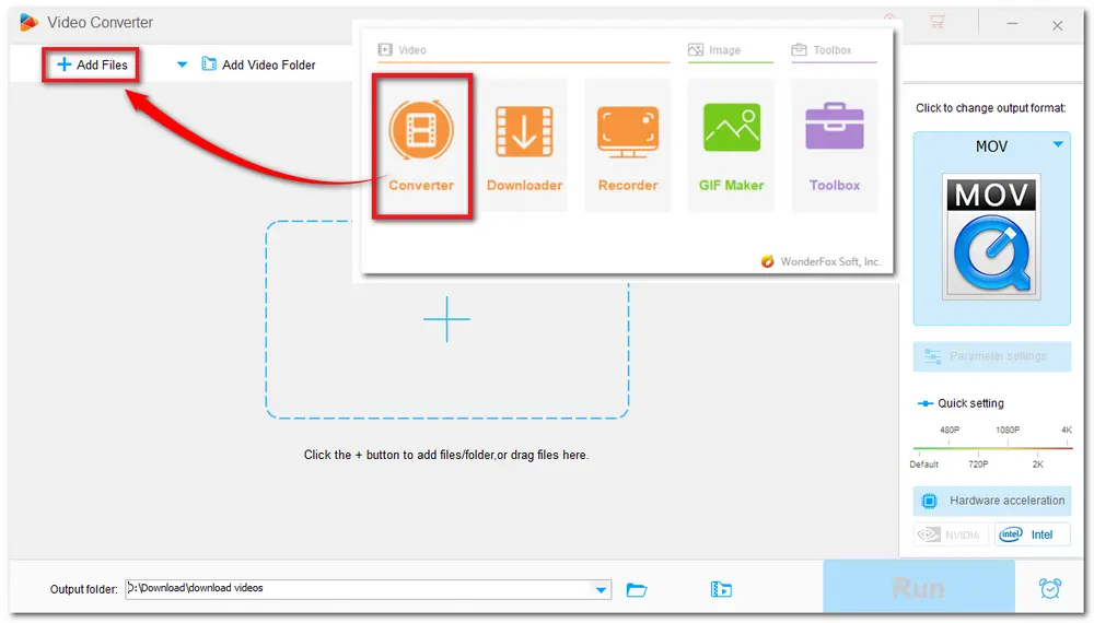 Open HD Video Converter Factory Pro and hit the Converter module to enter the main interface. Then click the + Add Files button or drag and drop the source MTS videos into the MTS to MOV Converter.