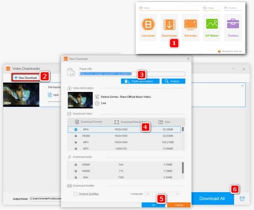 Launch the YouTube to WAV converter you just installed. Go to "Downloader", then click "+ New Download". Paste the YouTube link to the “Paste URL” box under the download video section. Press the “Analyze” button. It will demonstrate the video format or resolution after analysis, just choose the desired one and hit "OK".