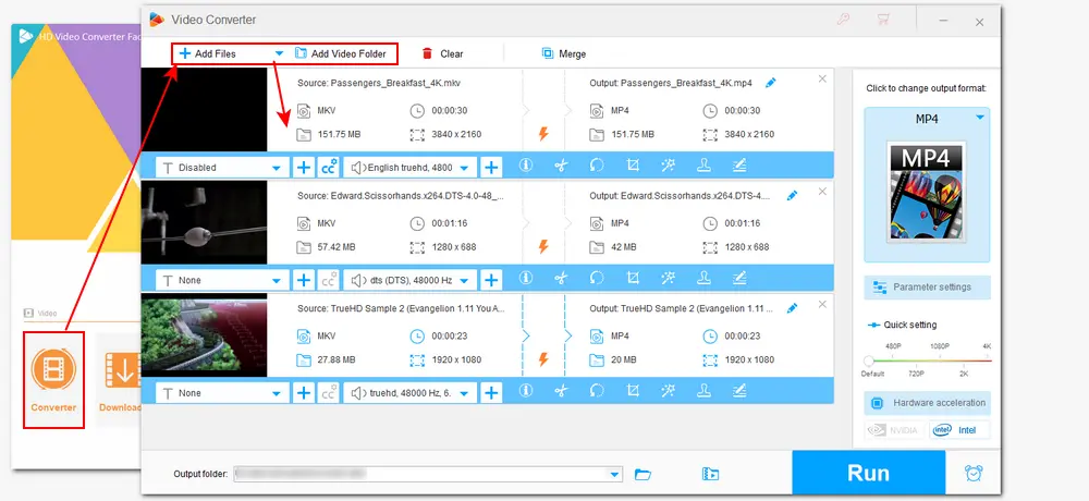Choose the first “Converter” module from the HD Video Converter initial interface to expand the converter program. Hit the “+ Add Files” or “Add Video Folder” button to import your videos (folders) to the workplace. You can also directly drag the source files and drop them into the program.