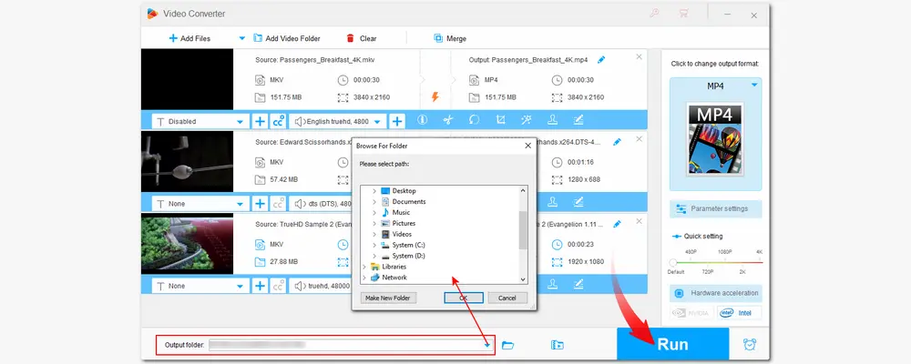 Click the inverted triangle button at the bottom of the interface to specify an output folder for the converted files, or you can leave it as default. Finally, press the “Run” button to start converting those unsupported videos to DaVinci Resolve compatible formats.