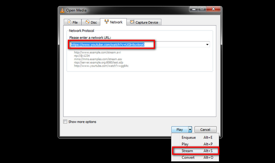 Step 4. Choose Stream option. Click on the inverted-triangle button next to Play, select Stream. On the Stream output window, select Next.
