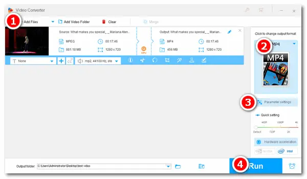 Set an output folder at the bottom to save the output audio. Then press Run to start converting MPEG to audio immediately. Several seconds later, you can find and enjoy the audio with leisure.