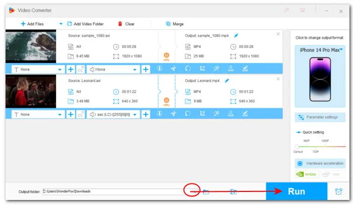 Featured with an intuitive interface, WonderFox HD Video Converter Factory Pro is a powerful video converter that assists you in processing multiple AVI files to iPhone in only 3 steps. Apart from AVI to iPhone conversion, this tool can cover all your audio and video conversion-related needs perfectly. It supports virtually all types of a/v files and provides 500+ output profiles, including common formats like MP4, AVI, MKV, H.264, H.265, AV1, etc., and device presets for iPhone, Android, TV, game console, and so on.