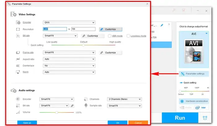 Step 4. This step is optional. After you choose AVI, the program will smart fit the video settings. If you have specific requirement for the output parameters, open ‘Parameter settings’ under the format image. Then you can modify the codecs, change video resolution, alter bitrate and frame rate, select channels, increase volume, etc. at your will. Don’t forget to save your changes by hitting ‘Ok’.