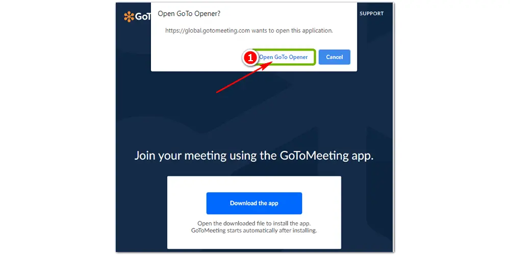 Step 1. Go to the official page and sign in (https://global.gotomeeting.com). If it’s your first time to use GoToMeeting, you need to register. Once you get to your account page and start an online meeting, you'll be taken to an interface that reminds you to download the GoToMeeting app, then you just need to click "Open GoTo Opener".