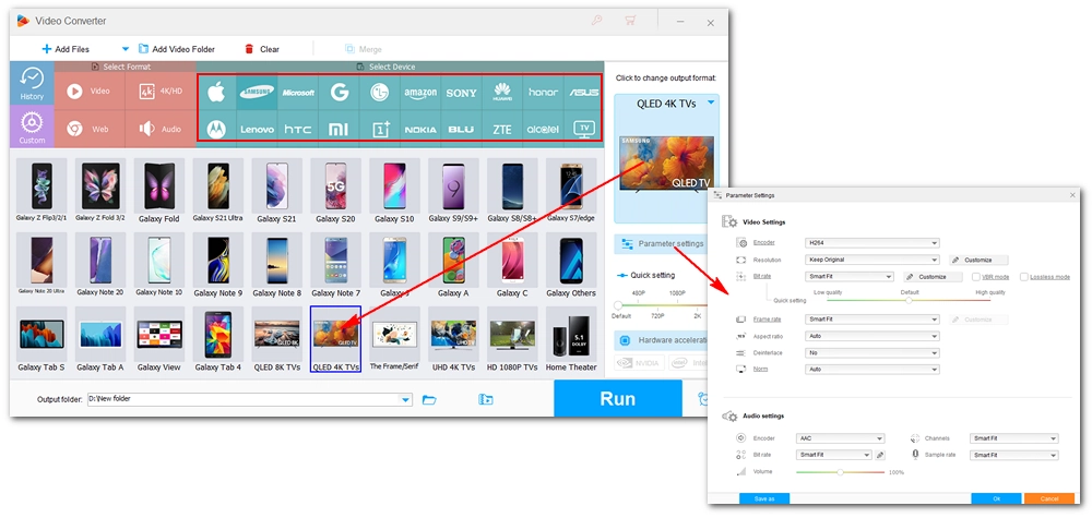 Click the right-side format image to open the output format list. You can go to the Device section and find the target TV profile. If it isn’t available, head over to the Video category and select one of your TV-compatible formats. Then, open the Parameter settings below and ensure the codecs and other parameters are supported.