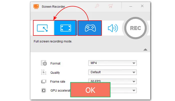 Next, hit the Game recording mode followed by the Full-screen mode or the Custom mode to set the recording portion of your screen.