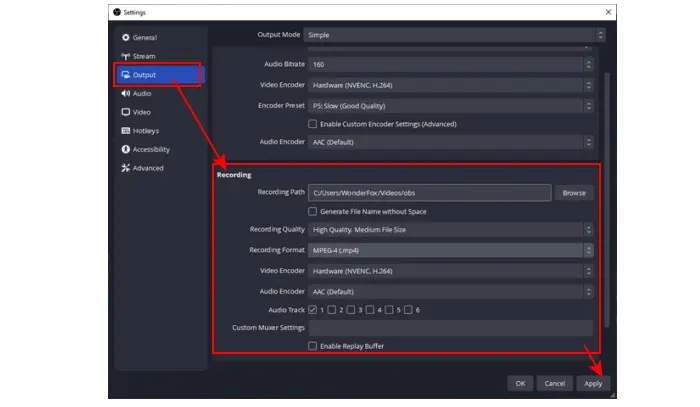 Step 3. Click the Output tab and go to the Recording section to tweak settings including format, encoder, audio track, etc., based on your real needs. Hit Apply > OK to back to the main window.