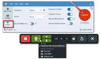 Snagit is a feature-packed paid software available on both Windows and Mac. It can help screen record video and a webcam along with microphone audio and system audio. You can also customize the recording area. However, Snagit only offers a simple trimming tool. Certainly, it has its merits, such as the support for picture-in-picture mode and drawing tools, making it an ideal choice to create demonstration videos.