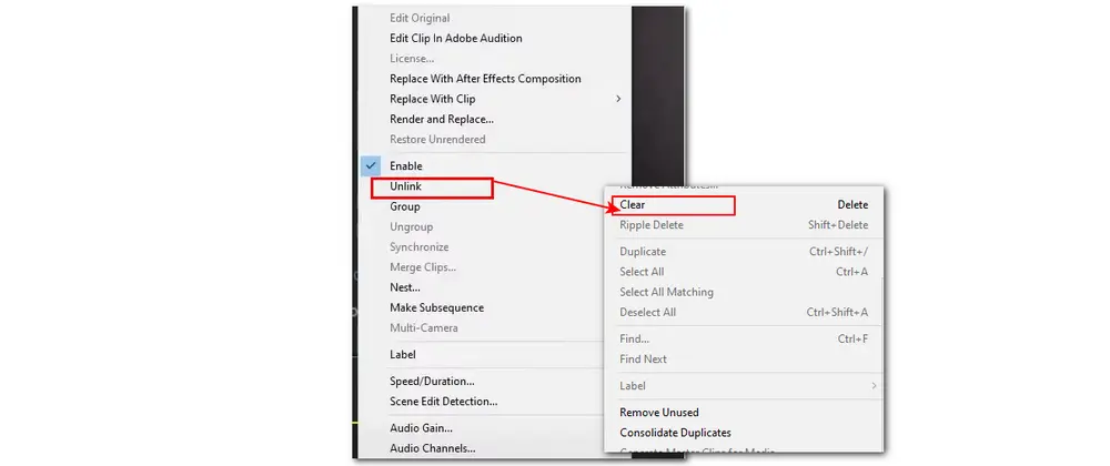 Select the video on the timeline and right-click it. Find the “Unlink” option in the pop-up menu. Press it to unlink the audio content from the video clip. When the audio is separated from the video, you can delete the separated audio layer by selecting it and hitting the delete key on your keyboard. Or you can also right-click on the separated audio layer and select the “Clear” option from the drop-down menu to delete the audio layer.