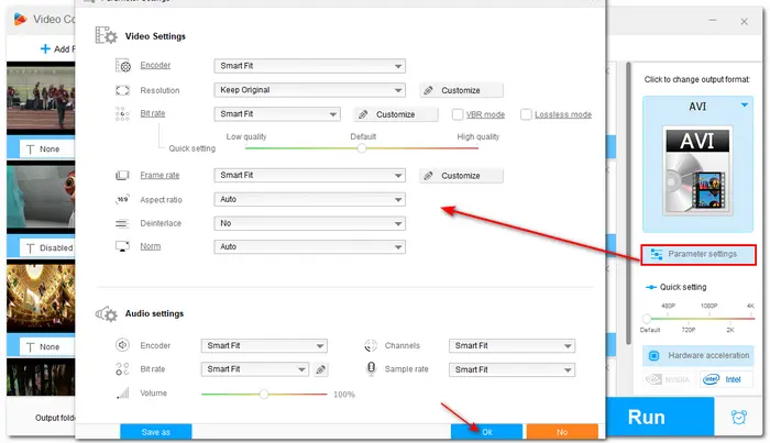 For further adjustment, you can open the “Parameter settings” window and then modify the video encoder, resolution, bitrate, as well as other settings to your desires. Then, click "OK" to save the changes.