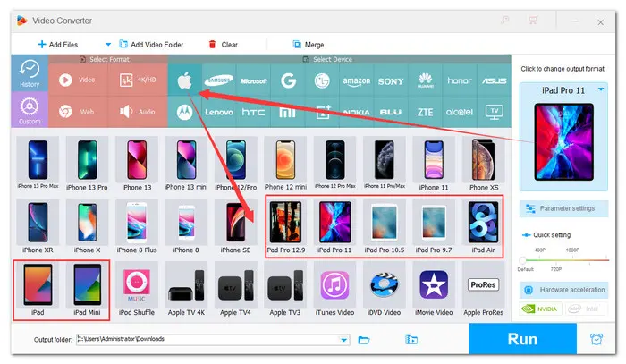 Click the format image on the right side. This video converter offers 500+ presets so that you can freely convert between different video/audio files. It has optimized presets for the latest devices. Just select the iPad model you are using as the output device. Once you select an iPad model, all settings will be optimized for that device automatically.
