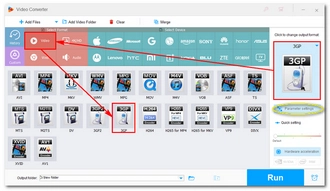 Expand the output format list on the right. Under the Video tab, click 3GP to select it as the output format.