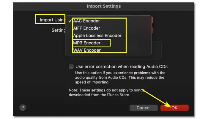 Step 3. Open the "Import Using" drop-down menu and select "MP3 Encoder". You can also adjust the audio settings if needed. Then, click "OK" to save the change.