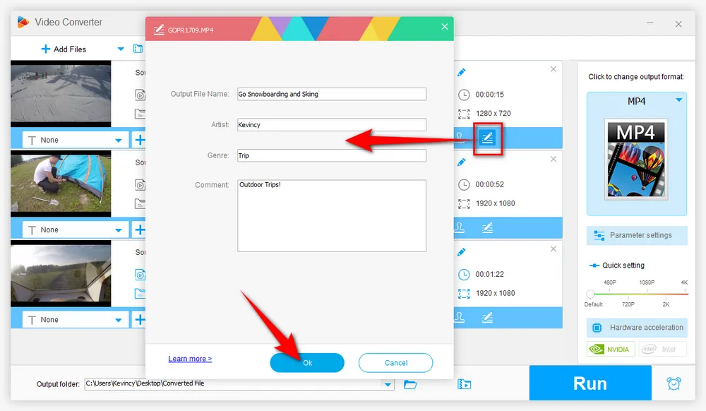Choose a destination folder on the bottom to save the export files. Finally, hit the "Run" button to start changing MP4 metadata without re-encoding.