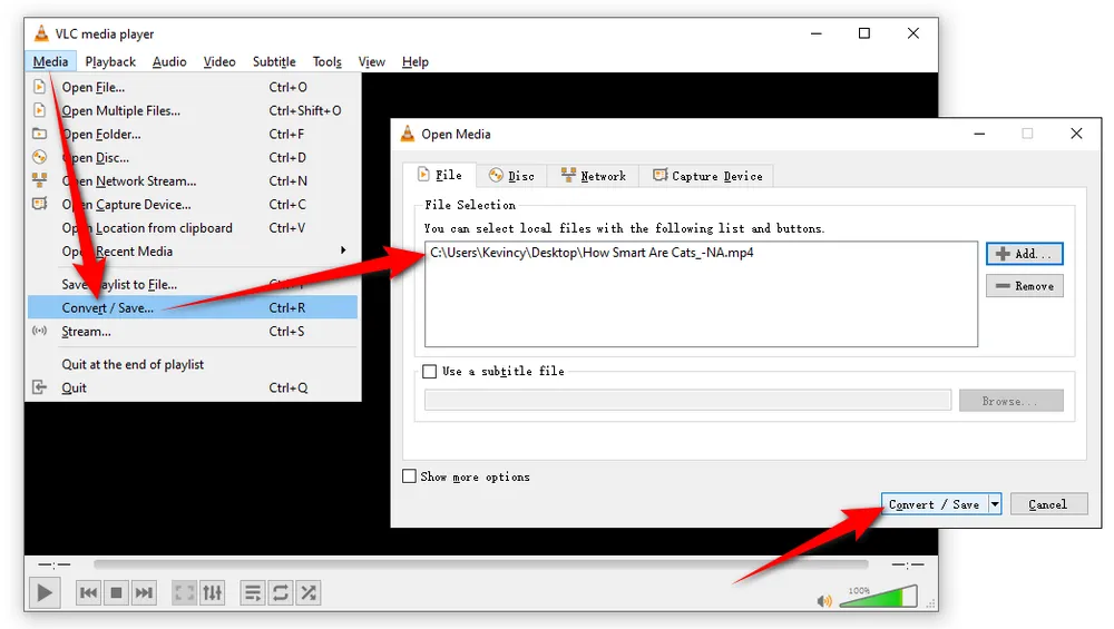 Step 3. In the "Open Media" window, click on the "Add" button to add an MP4 file. You can also add multiple files at once. After that, click on the "Convert / Save" button to open the "Convert" window.