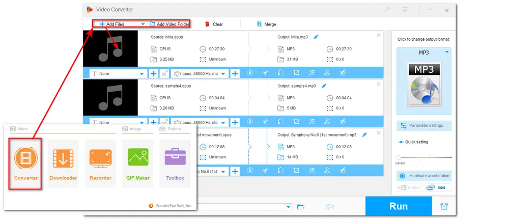 WonderFox HD Video Converter Factory Pro is a handy video/audio processing tool that can convert multiple Opus to MP3 (WAV, AAC, M4A...) with high-quality preserved. Additionally, it can also act as a media player to play Opus and other video and audio files on Windows. You’re even allowed to cut and merge the audio files, extract audio from video, download audio and video files, and more.