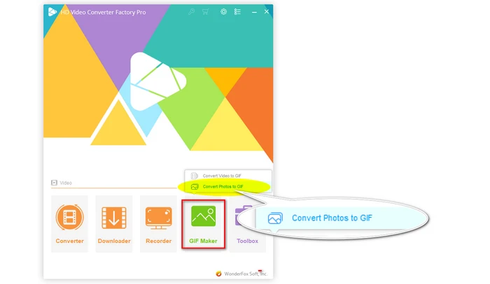 Install and runInstall and run WonderFox HD Video Converter Factory Pro on your computer. Hover your mouse on the "GIF Maker" module, then select "Convert Photos to GIF" option.