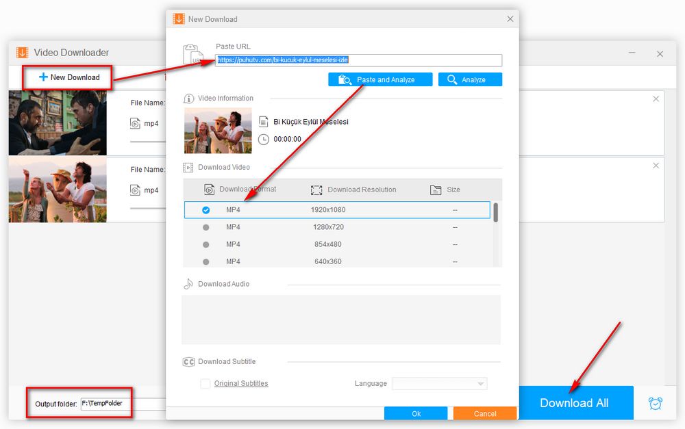 Copy and paste the URL of a Puhutv TV episode or movie for analyzing. It will display all available resolution and format below after a little while. Select one option and click OK to add it to download list.