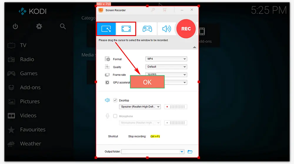 Tips. Kodi plays videos in the full screen by default. You can record all of your screen or select the desired part by dragging the red borders.