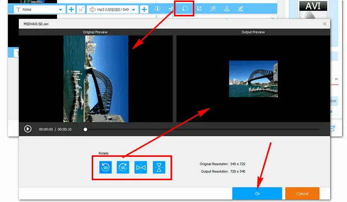 Click on the third Rotate icon under the video to enter the rotating window. You can rotate the video 90 degrees clockwise or counter-clockwise and flip the video 180 degrees horizontally or vertically according to your needs. After you adjust the video to the right direction, press OK to save the change.