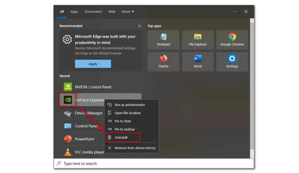 Step 1. Find the Nvidia GeForce Experience app from your Windows Start menu. Right-click on the app to Uninstall.