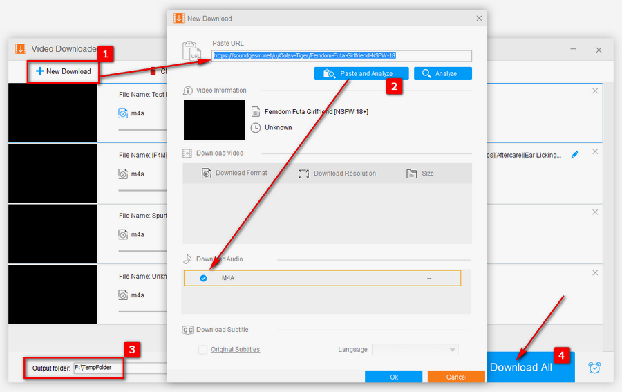 Step 2. A few seconds later, you'll find the M4A option right there. Click OK to add it to the download list. Repeat the steps to create multiple download tasks. Assign an output folder to save the downloaded audio files on the bottom, finally, hit "Download All" button to start the downloading process.