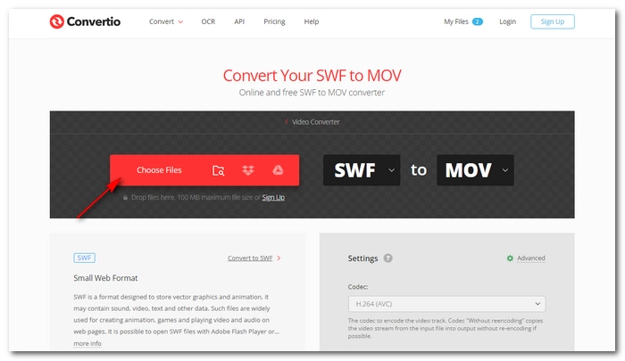 Open Convertio’s SWF to MOV Converter on your browser. Click Choose Files and select the SWF file for upload. Alternatively, you can import files from Dropbox or Google Drive.