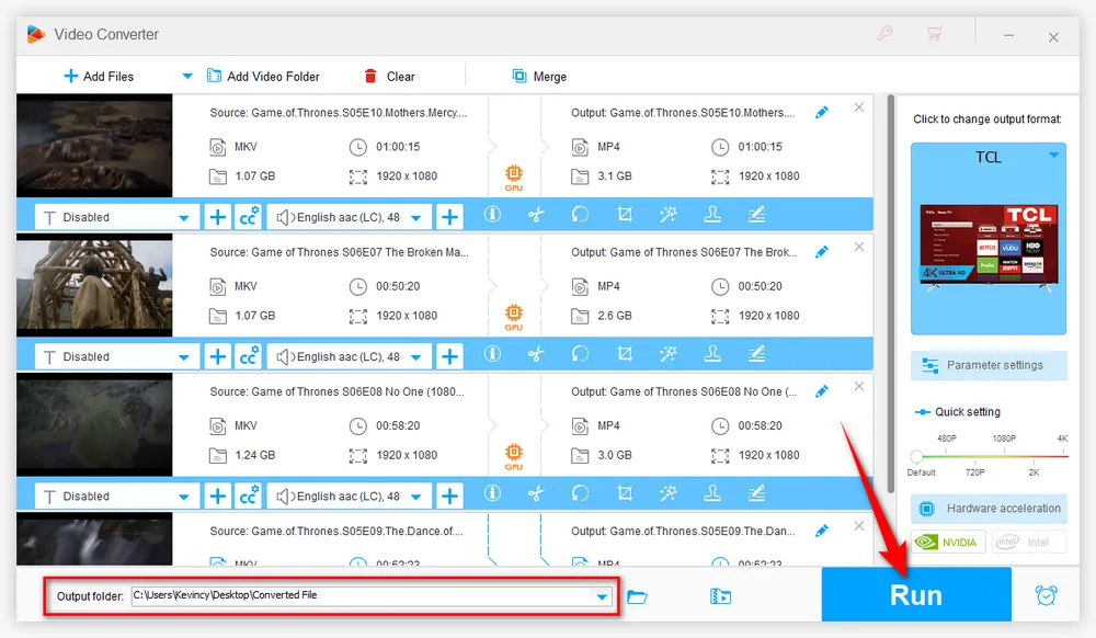 Specify a directory path on the bottom to save the converted video files. Finally, hit "Run" button to batch convert video files to TCL TV compatible format. With GPU acceleration enabled, the process is supposed to be complete at a blazing-fast speed.