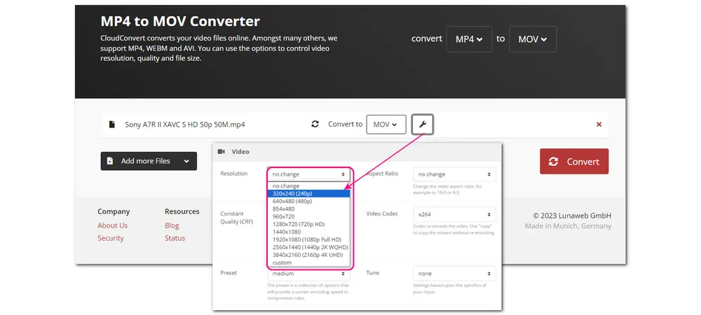 CloudConvert is one of the best online video converter tools that can help you finish the video resolution conversion without hassle. It enables more than 200 formats for media file conversion. And the video conversion is supported with several popular output formats like AVI, MP4, MOV, MKV, WEBM, etc. After importing the video file and choosing the output format, then you can adjust the video aspect ratio, codec, frame rate, etc. and resolution as well. For video resolution, it supports the highest 4K UHD video resolution and lowest 240p. It even provides some simple editing tools to help you trim video and add subtitles, watermarks, etc. Its free plan allows 25 conversions per day with 1 GB size for each file. And the output files has no watermark.