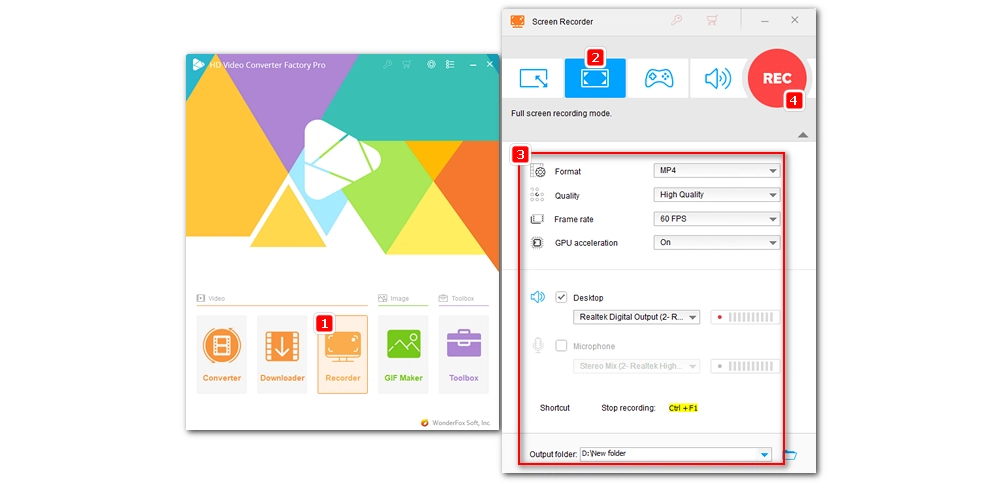 Step 3. Click REC to start recording (there is a 5-second countdown before recording starts). When recording is complete, click Stop or press Ctrl + F1 to stop recording. The recorded video will show up in the output folder you set.