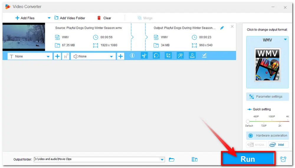 WonderFox Free HD Video Converter Factory is a free and efficient video editor that works perfectly with WMV and many other formats. It lets you trim, crop, rotate, merge, add subtitles and soundtracks, apply effects, and more. Beyond basic editing, you can also fine-tune video and audio settings such as resolution, bitrate, aspect ratio, and volume. If needed, you can even convert WMV to 500+ formats and device presets.